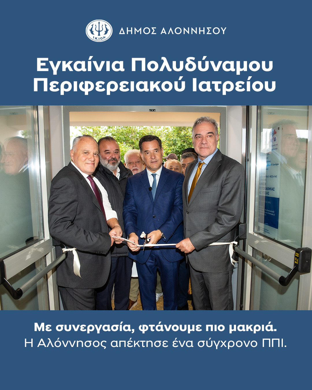 Σε ιδιαίτερα θετικό κλίμα πραγματοποιήθηκαν, την Τετάρτη 12 Νοεμβρίου 2025, τα εγκαίνια των αναβαθμισμένων εγκαταστάσεων του Πολυδύναμου Περιφερειακού Ιατρείου (ΠΠΙ) Αλοννήσου, παρουσία του Υπουργού Υγείας κ. Άδωνι Γεωργιάδη, του Διοικητή της 5ης ΥΠΕ Θεσσαλίας – Στερεάς Ελλάδας, κ. Φώτη Σερέτη, και του Επίτιμου Δημότη Αλοννήσου, Προέδρου της Seajets και της ΑΕΚ, κ. Μάριου Ηλιόπουλου.
