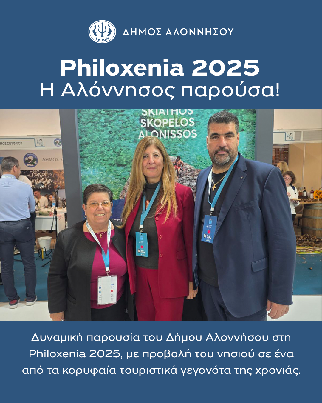 Ο Δήμος Αλοννήσου συμμετείχε στη διεθνή τουριστική έκθεση Philoxenia 2025, η οποία πραγματοποιήθηκε από τις 14 έως 16 Νοεμβρίου στη Θεσσαλονίκη, στο πλαίσιο της στρατηγικής του για ενίσχυση της τουριστικής προβολής του νησιού στην Ελλάδα και το εξωτερικό.